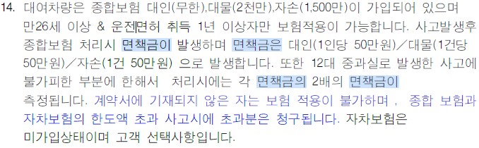 2021년 제주도를 여행하면서 렌터카를 빌렸습니다. 운전을 잘하는 편은 아니기 때문에 렌터카 업체에서 제공하는 보험 옵션 중 모든 것을 가장 비싼 보험으로 넣었고, "이 정도면 사고 나도 큰 일은 없겠다"라고 생각하고 있었습니다. 그러나 렌터카를 몰던 중 경미한 사고가 발생하였고, 렌터카 업체에 전화하여 보험 처리를 진행하겠다고 했습니다. 그랬더니 보험 처리를 위해서는 면책금 50만 원이 발생한다고 하더군요. 정신이 없고, 피해 차량에 폐를 끼치는 것 같아 아무 생각 없이 우선 50만 원을 입금하였고 보험처리를 했습니다. 뒤늦게 계약서를 살펴보니 면책금에 대한 사항이 기재가 되어 있었습니다.