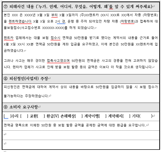 피해구체를 신청하기 위해서는 피해사건을 명확하게 제시하셔야 하며, 저는 어떤 임대 계약을 했고, 어떤 사고가 발생했으며, 면책금을 지불하게 될 수밖에 없었던 이유를 명시하였습니다. 상황에 맞추어서 잘 수정해서 제출하시면 될 것 같습니다. 피해구제신청을 하실 때 관련된 첨부 자료를 추가로 제출하실 수 있으며, 앞서 설명드린 사진, 계약서, 매출전표 등을 함께 제출하시면 됩니다.